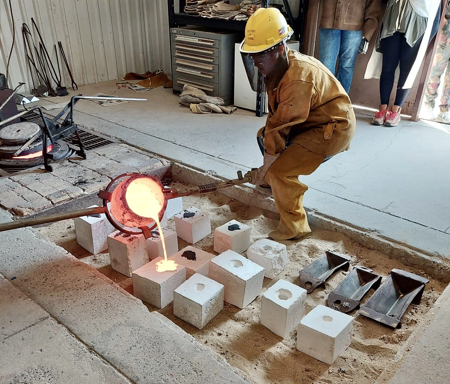 Holt and another teacher, both clad in protective leather gear and face shields, had melted the bronze in a furnace set in the floor, before quickly pouring the glowing, bright orange liquified metal into molds waiting a few feet away in a sand pit.